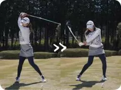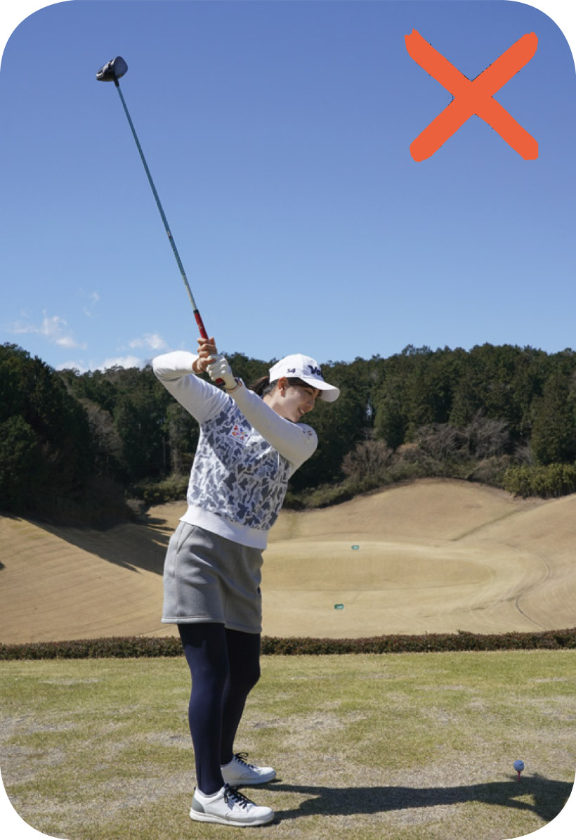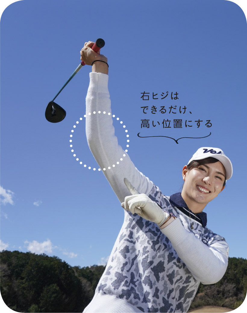 トップでは右ヒジがなるべく高い位置にあることがポイントです。ヒジがその高さになっていれば手首は頭より高いポジションになっていると思います。飛距離アップのためには、まずは高いトップを意識しましょう!