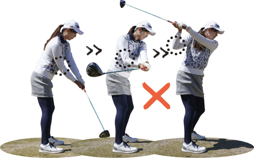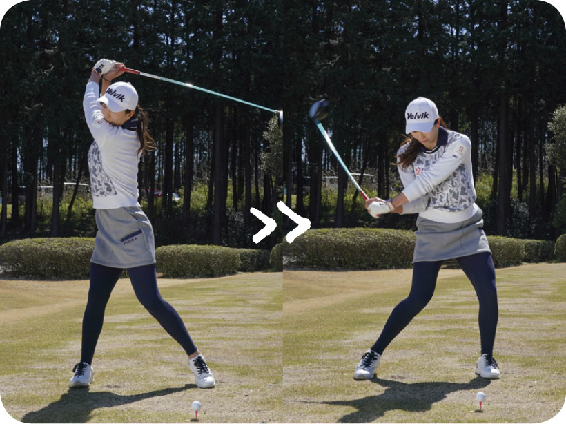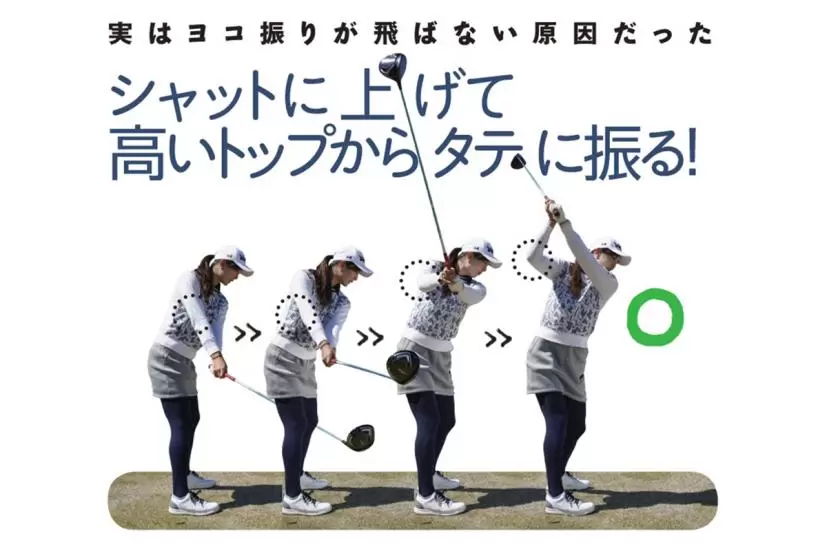 よくアイアンはタテ振りだけど、ドライバーはヨコ振りと言う人がいますが、飛距離を考えたら、絶対にドライバーでもタテ振りの方が有利です。タテ振りにすることで上から下へ重力のパワーによってヘッドスピードが速くなります。