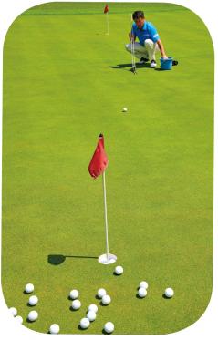 パッティングが苦手な人の特徴として、『イメージ作り』がうまくできていないことが多いです。それを、今回のテーマの「カップ4個スライスのラインで考えてみましょう。多くの人は、カップから4 個分左に仮想カップを設定し、そのカップをボールを結ぶライン上に『頂点(目標)』を設定し、そこに向かい打っていきます。これは打つ時にイメージが出しやすいのですが、足元の傾斜を忘れていたために、この設定は間違いでした。そこで今度は、カップ4個分左に設定したラインよりも内側にラインを設定しなければならないわけですが、このような傾斜の場合は、そのラインが「雨どい」であるというイメージを持つと良いでしょう。この溝に沿ってボールをコロがして行けばイイと思うことで手がスムーズに動くので、不思議と距離感もタッチも合ってきます。ロングパットは漠然と打つことが多いモノですが、こういったイメージをもつことでカップインの確率も上がってきます。