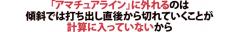 横田 傾斜にかかるラインでは、自分が傾斜の上に立っているということを忘れがちなんですよ。それで、自分の考える傾斜の『頂点』までは平坦で真っすぐなラインであると思って打つわけですけど、実はボールはコロがり始めた直後から傾斜の影響を受けてスライスとかフックをし始めているわけです。だから、頂点に届くことなくボールは傾斜をコロがっていくので、傾斜がきついケースではカップの手前で思いのほか切れていく。これが『アマチュアライン』の正体です。スライスラインとなるツマ先下がりのケースでは、ボールはコロがり始めてからすぐにスライスしているのが分かりますよね。それがイメージできれば、曲がるラインがもっと入るようになります。