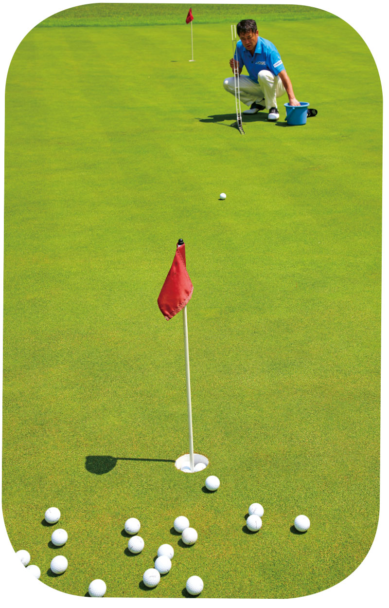 横田 スティンプメータの向きは、パッティングの時のパターのフェース向きと同じです。そこで、スティンプメーター先端が向いている位置を見ると、カップ4個分ほど左を向いています。つまりこのラインは、「カップ4個分のスライスのライン」という傾斜になるわけです。では、このカップ4個分のスライスラインをどのように打っていくべきなのか、そのヒントは画像2に隠されています。