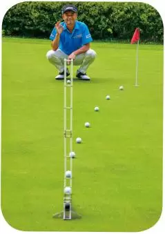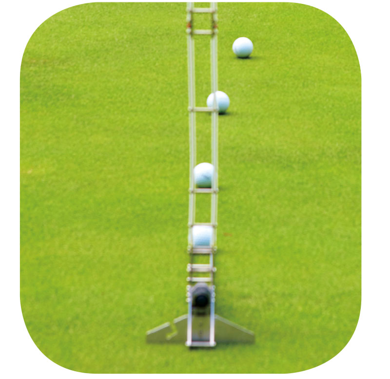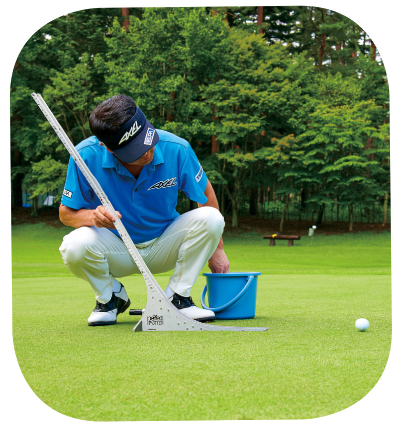 スティンプメータのような毎回、同じ速度や打ち出し向きが確保できる機器や台などを用意し、コロがした時にカップにジャストインするくらいの高さにボールをセットする。そして、カップインするまで何回も転がして、その位置からコロがした時の、傾斜に対するカップインするラインを特定する。