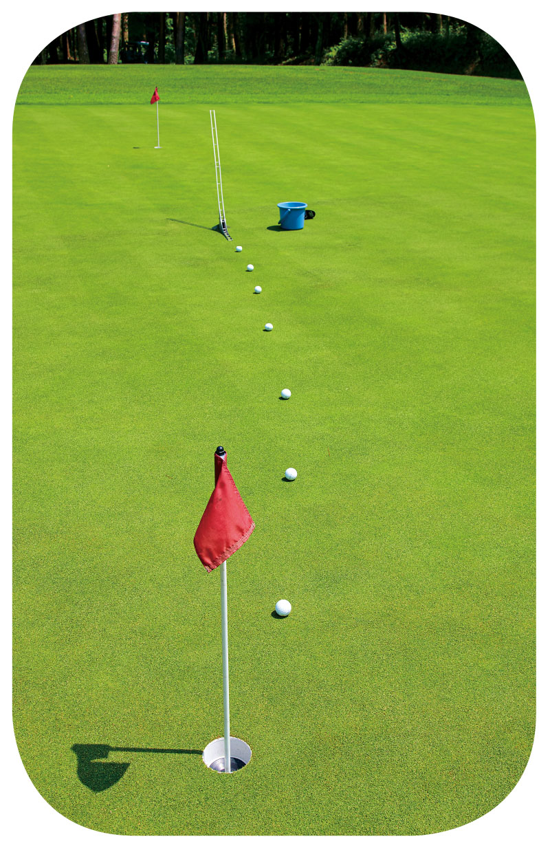 パッティングが苦手な人の特徴として、『イメージ作り』がうまくできていないことが多いです。それを、今回のテーマの「カップ4個スライスのラインで考えてみましょう。多くの人は、カップから4 個分左に仮想カップを設定し、そのカップをボールを結ぶライン上に『頂点(目標)』を設定し、そこに向かい打っていきます。これは打つ時にイメージが出しやすいのですが、足元の傾斜を忘れていたために、この設定は間違いでした。そこで今度は、カップ4個分左に設定したラインよりも内側にラインを設定しなければならないわけですが、このような傾斜の場合は、そのラインが「雨どい」であるというイメージを持つと良いでしょう。この溝に沿ってボールをコロがして行けばイイと思うことで手がスムーズに動くので、不思議と距離感もタッチも合ってきます。ロングパットは漠然と打つことが多いモノですが、こういったイメージをもつことでカップインの確率も上がってきます。