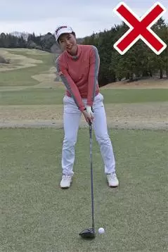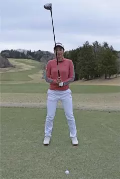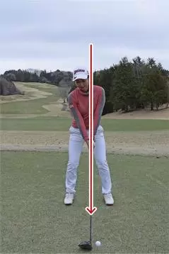 この上体が右に傾きすぎるクセを治すために、直立の姿勢でクラブを胸の前で真っすぐ立てて、その状態から地面に真っすぐ下ろし、それからクラブヘッドをボールに合わせるようにするんです。