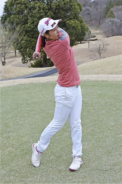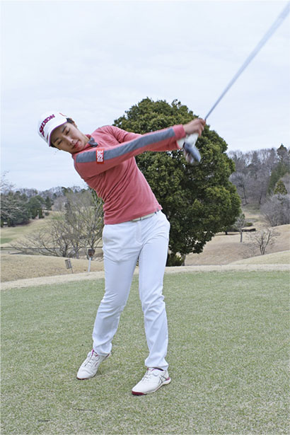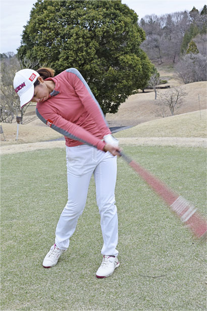 ボールがあるとインパクトを気にして当てにいってしまいやすいけど、素振りならインパクト地点を気にせずにフィニッシュまでしっかり振り切れます。私はインパクトは通過点にすぎないと思っていますから、何も考えないで振り切るという感覚を大事にしたいんです。