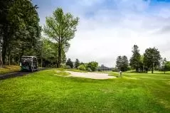 続いて同じく西コース7番PAR3のグリーンはバンカーにガッチリ護られていて花道が狭い。もうのせるしかありません。この時はちょうど霧が出ていて幻想的に。グリーン奥に見える三角形の樹木と山がアクセント、まるで高原ゴルフのようでした。