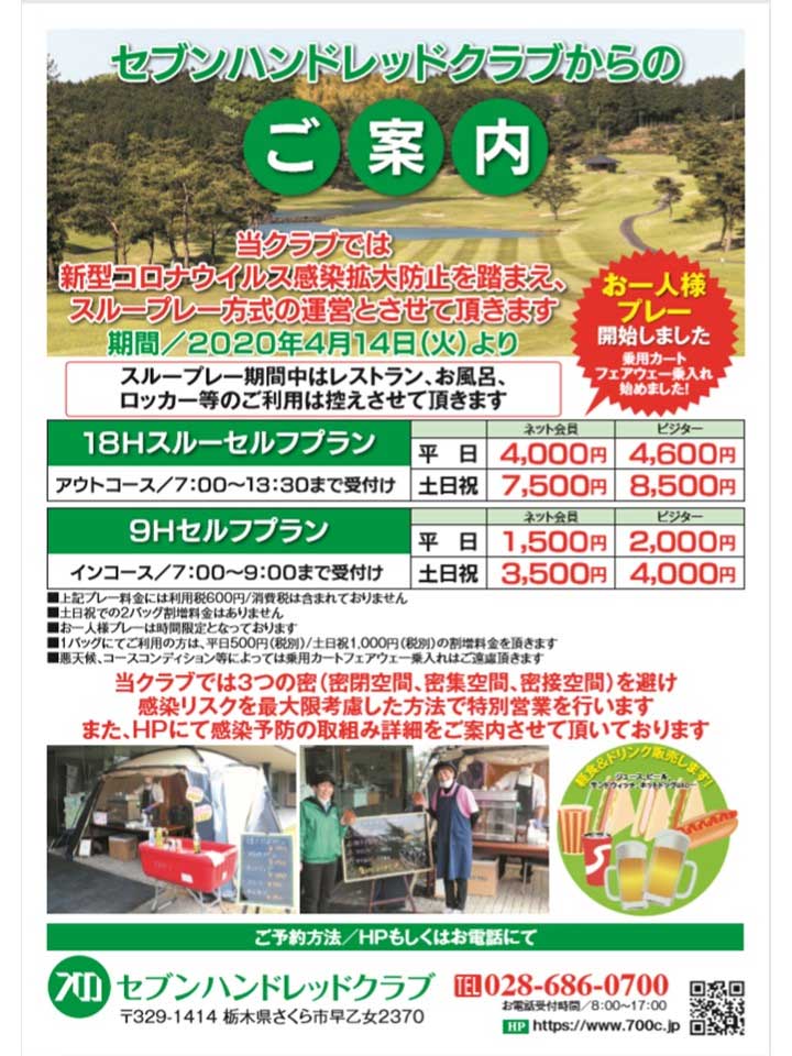 栃木県のセブンハンドレッドクラブが新型コロナウイルス感染防止対策で従来の運営方式を変更し、ワンウェイスループレー方式を4月より導入して営業している。この方式は休憩を挟まずにラウンドするためレストラン、浴場、ロッカーなどクラブ内の密室空間を使用せずにゴルフ場を利用することができる。またフェアウェイのカート走行も開始するなど感染拡大防止に向けた対策を複数講じている。