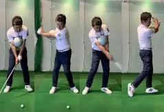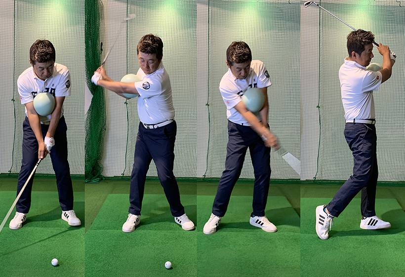 勝又「上体がしっかりと捻れていればテークバックはそのくらい上がっていれば十分です。アマチュアの人はどうしても手だけでもっと上げようとするからオーバースイングになりがちなんですよ。ではそのままボールを打ってください。フィニッシュは大きくとらなくていいので、最後までボールを落とさないように」