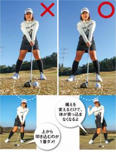 芝が薄い場合は、ヘッドの入れ方に注意します。体が突っ込むのは、球が左足寄りにあるので、インパクトでヘッドが届かないと思い体が突っ込んでしまうのが原因です。
