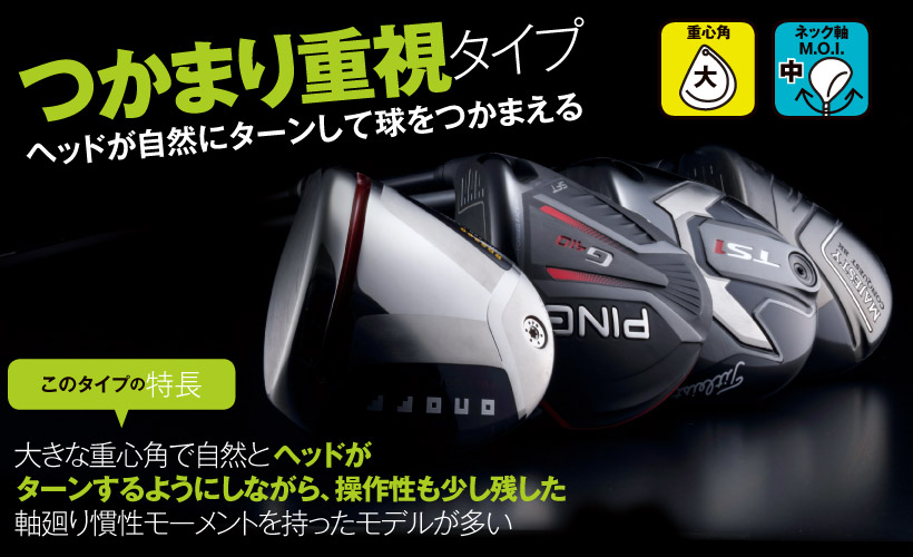 [特徴]大きな重心角で自然とヘッドがターンするようにしながら、操作性も少し残した軸廻り慣性モーメントを持ったモデルが多い