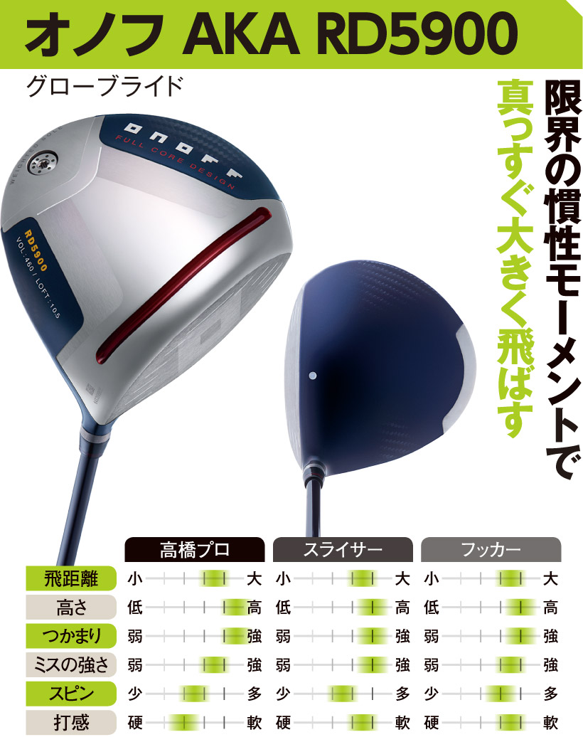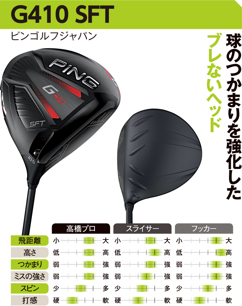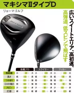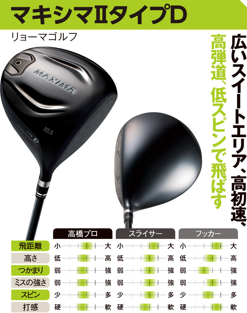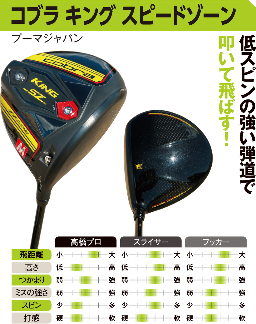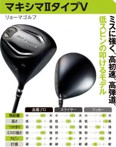 適度に球がつかまりますが、中高弾道でスピン少な目。シャフトもしっかりしているので、リストワークが大きく、しっかりと球を叩いて飛ばしたいフェードヒッター向けです。