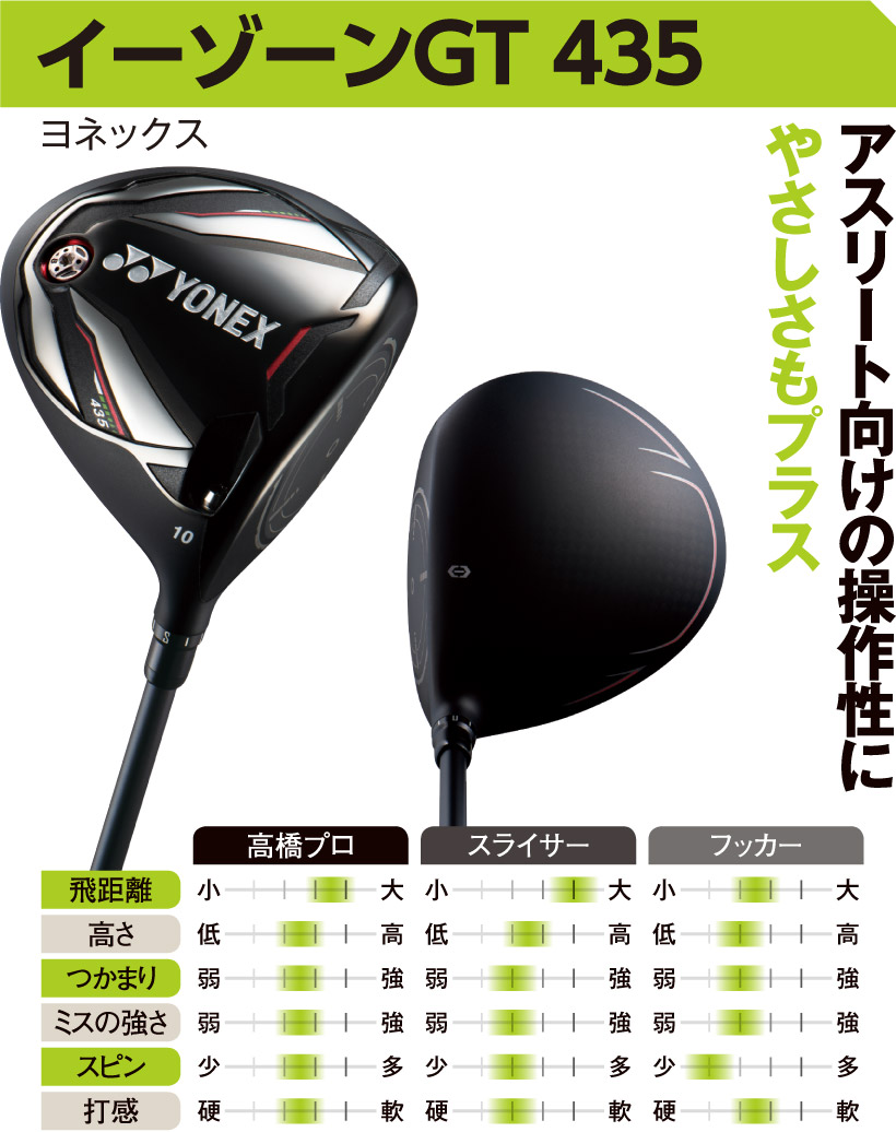 435より球のつかまりが増します。スイートエリアが広く、曲がりも少なくなり、適度なハジキでボール初速も上がります。右方向の曲がり幅が減る分、飛距離が伸びます。
