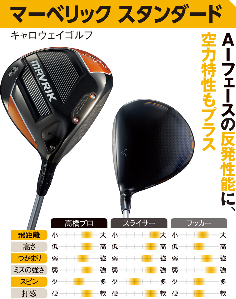 マーベリックシリーズにはキャロウェイ自慢のA.I.フェースが搭載されている。3つのヘッドタイプそれぞれに偏肉パターンを変えた設計で限界の反発性能を追求している。
