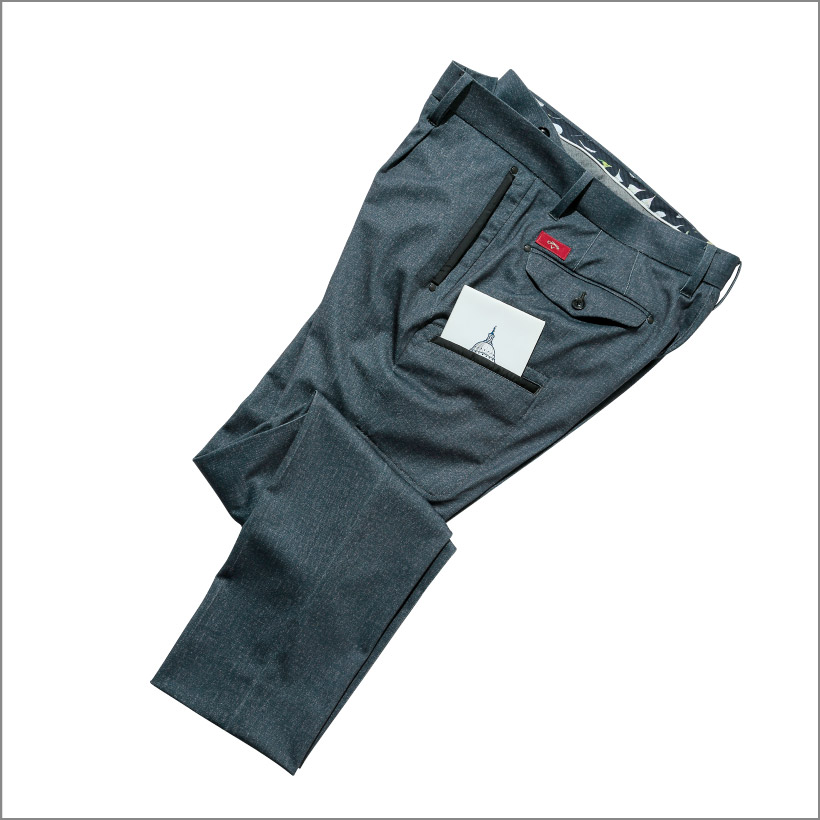 腰裏に「プランティカ」コラボのフワラープリントがあしらあれた、タック入りテーパードパンツ。