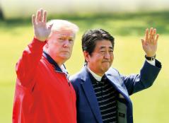 来日して茂原カントリー倶楽部でいっしょにラウンドした頃は親密距離にあったトランプ大統領と安倍晋三首相だが、新型コロナウイルスが蔓延した今はちょっと距離が離れた感じか。