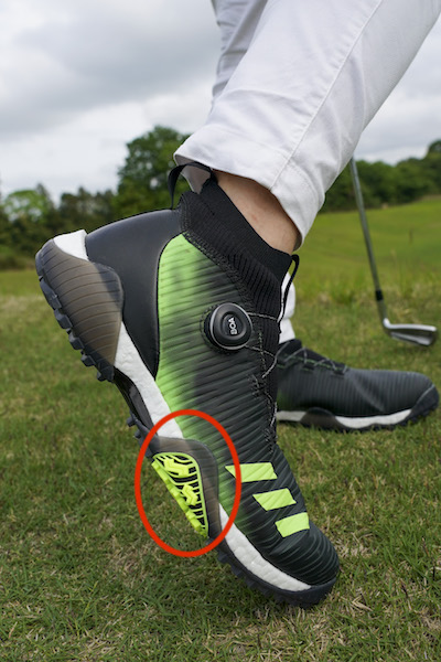 ミッドソールを包むように配されているのが「コントロールラップ」。これが「BOOST(TM)」のクッショニング性能とのシナジー効果を発揮し、スイング時の足元を支えてくれる。