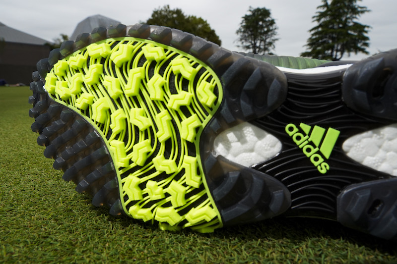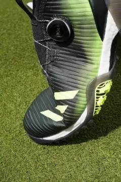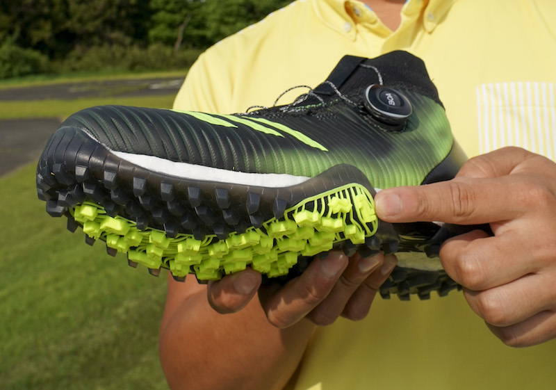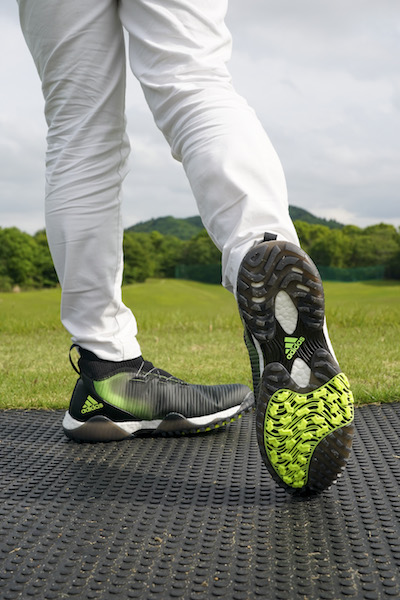 柔らかい履き心地ながら、歩くたびに力強く押し返してくる「BOOST(TM)」のクッション性。さらに、そのクッション性を損なわせることなく、スイング時の安定感を向上させる「コントロールラップ」。この先端テクノロジーの融合は、“ゼロベースから開発を考えた”ということを強く感じられる部分だ。