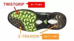 「ツイストグリップ」以外の部分は、「Zトラクション(Z-TRAXION)」と呼ばれる部分で、粘りのあるラバー素材でできている。縦と横方向に対して、特に高いグリップ力を発揮してくれる。この部分のグリップ性能は、芝上や傾斜地での歩きやすさや安定感に貢献してくれるのだろう。