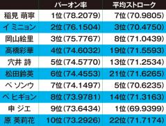 大活躍を見せた黄金世代の渋野日向子、河本結、原英莉花、小祝さくらなどは全員パーオン率70%を越えていた。また黄金世代の一つ下にあたる稲見萌寧が記録した78%は歴代パーオン率でもダントツ1位の記録である。黄金世代を中心とした若い選手がツアーのレベルをあげていることは、このパーオン率から見ても明らかだろう。