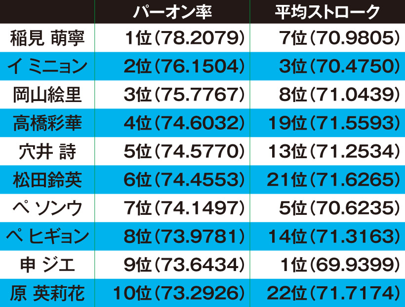 過パーオン率の上位選手は平均スコアも上位に!