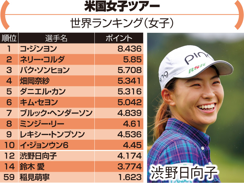今年3月21日に一時凍結された男女の世界ランキング。延期された21年の五輪出場を狙う渋野は12位のまま。