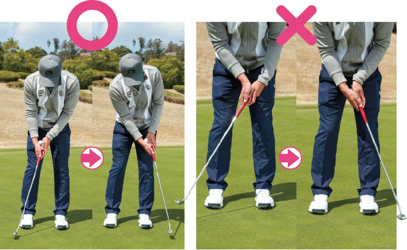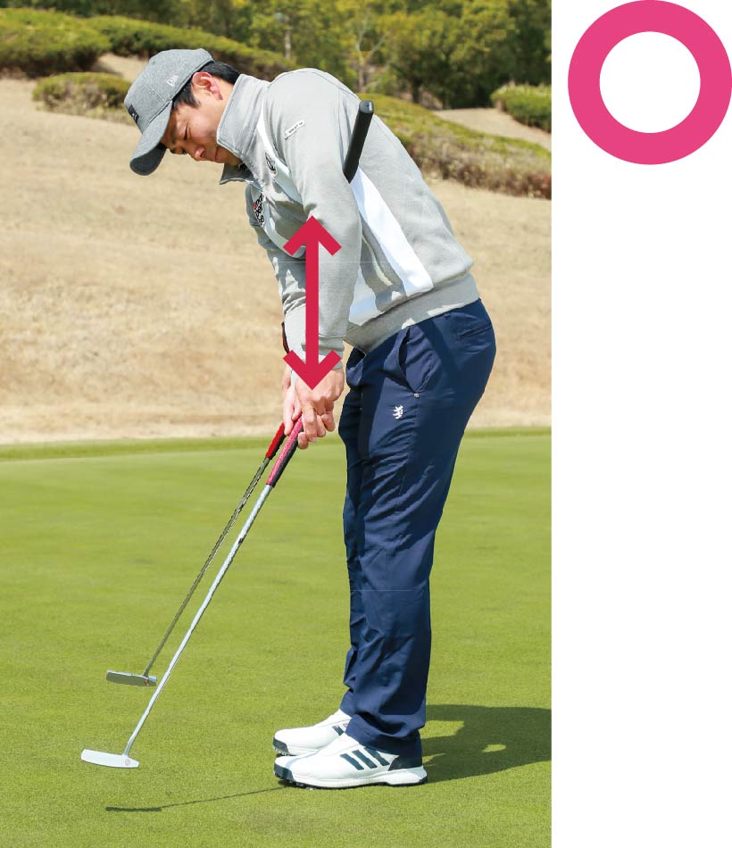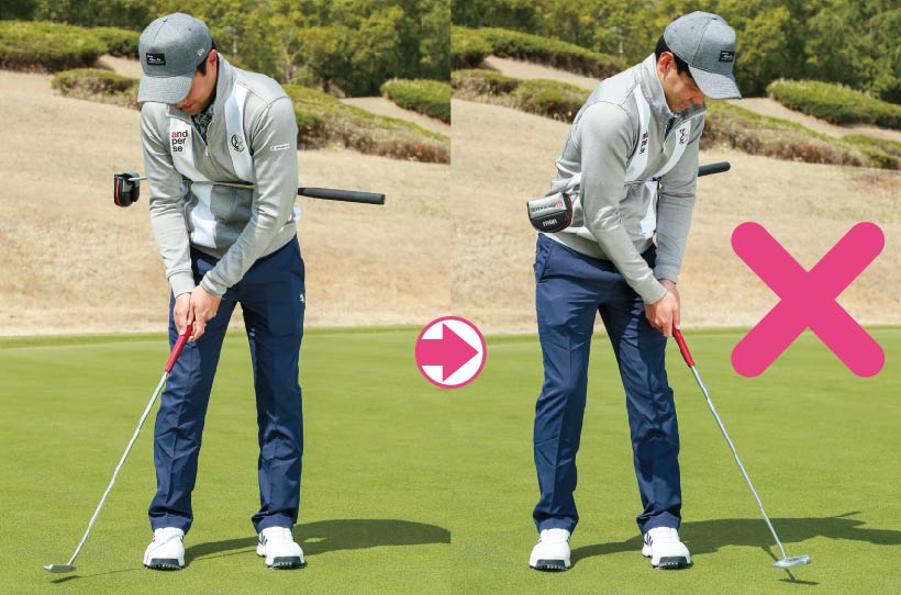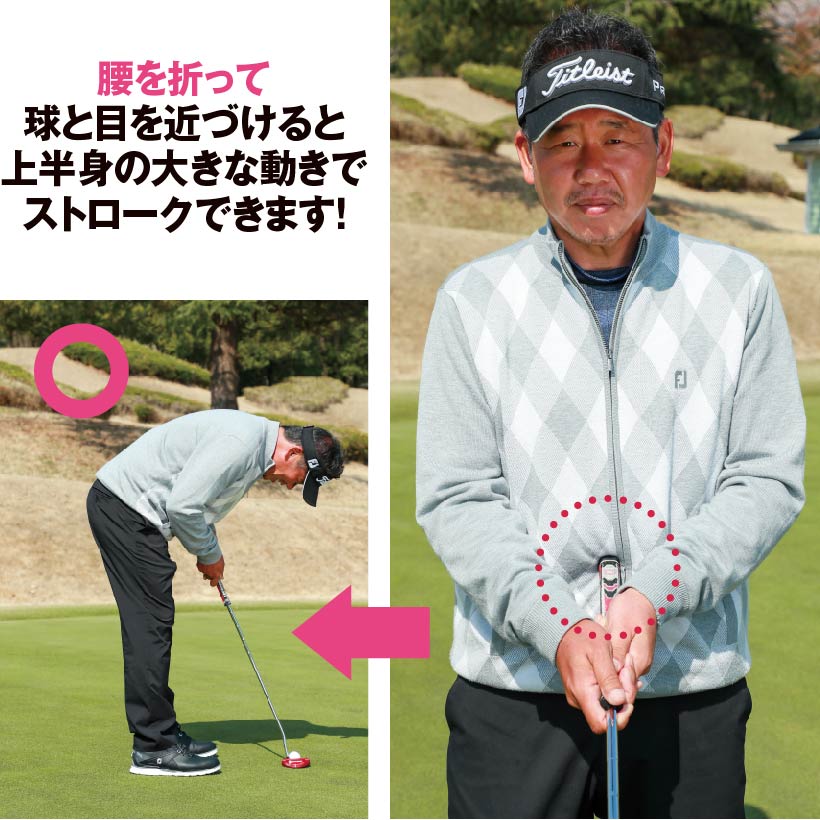 手首を使ってしまう人に多いのが、アドレスで直立してしまい、手元がブラブラになっているケース。そういう場合は、立ったままグリップエンドをお腹につけて、腰から上半身を前傾させてみてください。そうすると、手の感覚が出やすくなり、視点もズレなくなります。前傾を深くとることで、お腹を中心とした大きな筋肉を使うストロークができるので、手元を使わず安定したストロークができます。