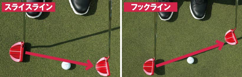ヒッカケやプッシュが多くなってしまうのは、単純にヘッドの軌道が目標に対して真っすぐ振れていないことが原因です。よくあるストロークのミスとして、ヒッカケてしまう人はアウトサイドインのヘッド軌道、プッシュしてしまう人はインサイドアウトの軌道になっています。どちらかにズレているなと感じたら、自分のストロークを見なおしてみましょう。