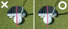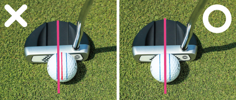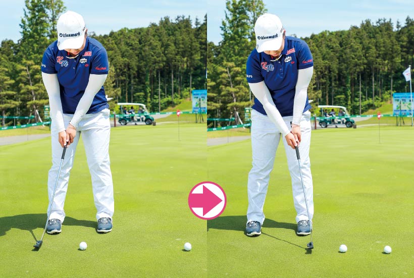 たとえば、私にとっての基準は、フェースと球の中心を合わせて構えられているかどうかです。右に出ちゃうときは、ヒール寄りに球を置いています。