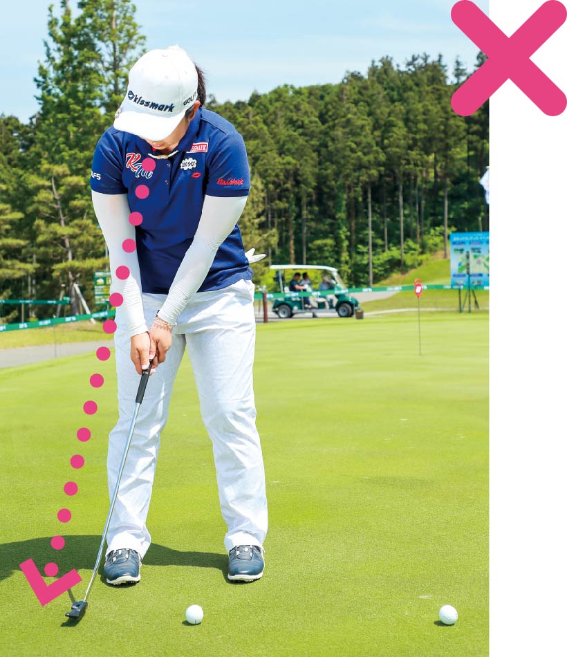 私のパットの悪いクセは、ボールが右に出ちゃうこと。修正できずにいると、今度は右を嫌がってヒッカケてしまうんです。