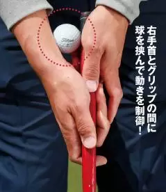 普段のグリップで右手首とグリップの間に、球が落ちない程度に挟んでみてください。オーバーやショートは、手首の動きを使いながらストロークすることで生まれるので、このドリルで手首の動きを制限します。球を挟むことで、手元とクラブの一体感が生まれて、スムーズなストロークが体感できます。