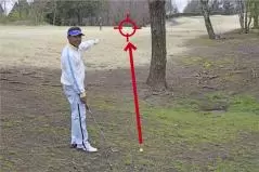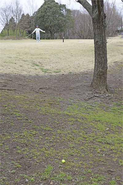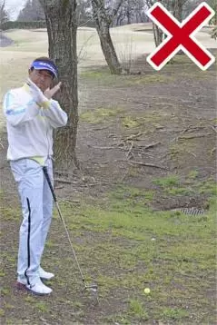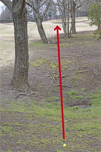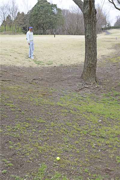 林の中は芝がなくて、土がむき出しになっているケースがほとんど。ボールをうんと右に置いて上から鋭角に打ち込んでしまうとインパクトが詰まってダフリが生じやすいので注意しましょう。打つ前にパターを手にしているイメージでロングパットを打つ感覚の素振りを数回繰り返して感じをつかんでおくとミスを防げます。