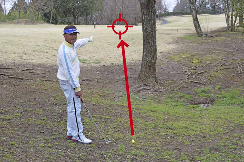 ボールが上がりすぎると木の枝に当たる心配があるなら、6番アイアンくらいがオススメ。アプローチショットくらいの小さい振り幅でもキャリーが50ヤード近く出ますからフェアウェイへと運ぶには有効的です。スタンスはやや狭めにし、ボールの位置はスタンスの中央か1個ぶん右足寄り。両手は左モモのツケ根の前。そしてクラブを短く持ち、パターのイメージでボールを横から払い打つのがコツです。
