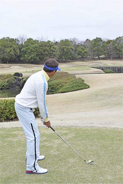 もう一つは目標の設定です。グリーンの手前側や両サイドにバンカーや池がなければグリーンの真ん中狙いのままでOK。でもこのホールのようにグリーンのすぐ手前に大きな池があるときは状況が変わってきます。グリーンの中央まで届くクラブを持ち、ピンを真っすぐ狙って打った。当たりがよくてワンオンに成功。そんな具合にシナリオどおりにいけばいいのですが、当たりが薄くてちょっとショートしてしまうことが多いという人は、ピンを真っすぐ狙うのは危険です。