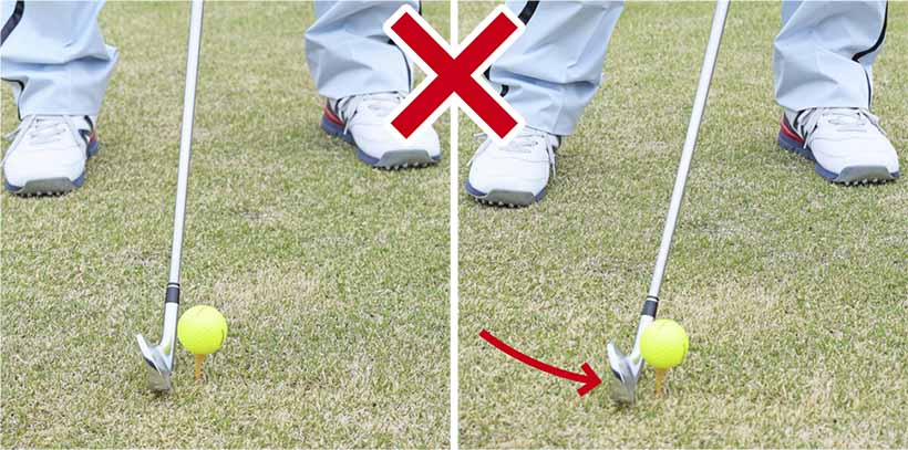 アイアンショットのレベルを上げる練習をするなら、ハイティアップの練習がオススメです。ティアップをうんと高くし、クラブヘッドをボールの高さまで浮かせて構え、ボールだけをクリーンヒットしましょう。上から鋭角に入っても下からすくい上げてもいけません。クラブヘッドを鈍角に入れて、ボールを横から払い打つイメージでレベルに打つのです。