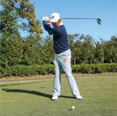大事なのは自分のスイングにおける最大の飛距離を求めないこと。無理に飛ばそうとして曲げていては意味がない。7、8割のパワーで飛ばして曲げないスイングを身につける。 - ポイント2:クラブの動きに身を委ねれば曲がらない
