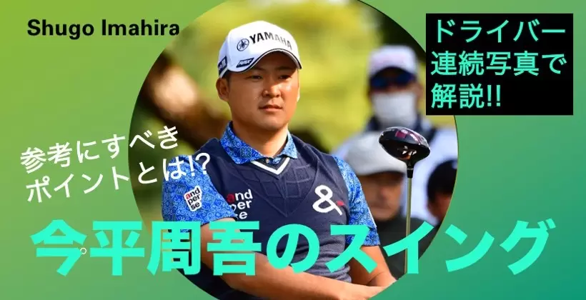 今平選手は、上腕から肩にかけてよけいな力が抜けたアドレスから、腕の力に頼らず体幹を使った回転でバックスイングしています。右サイドでパワーを溜め、左サイドへあまり大きくシフトせず、体幹を使った回転で歯切れよく振り抜いていくスイングです。