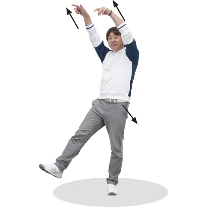 スイング中のバランスを保つには、カラダの左右、上下、前後が別々に動くことが必要。同方向に動くとバランスは崩れる。