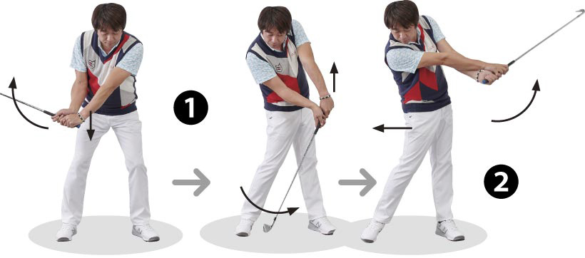 ❶右手を「支点」に左手で下に力を加えてテークバック。インパクトでは左手を引き上げることで、右手を「支点」にヘッドが走る。