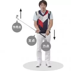 右手を「支点」にして、左手を下方向に力を加えると、クラブヘッドは上に上がる。この「テコ」の動きを活用すると、スイングがやさしくなる。