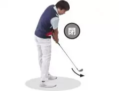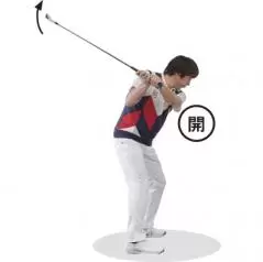 テークバックの反動でトップではフェースは開く。