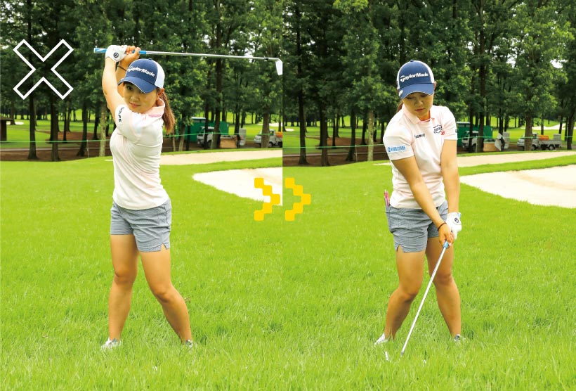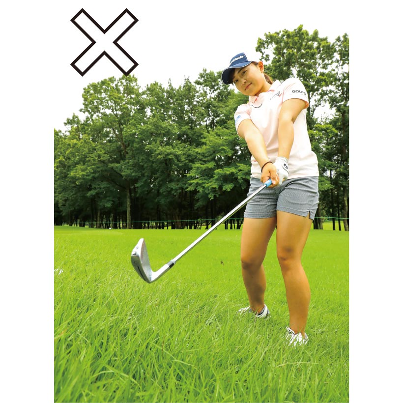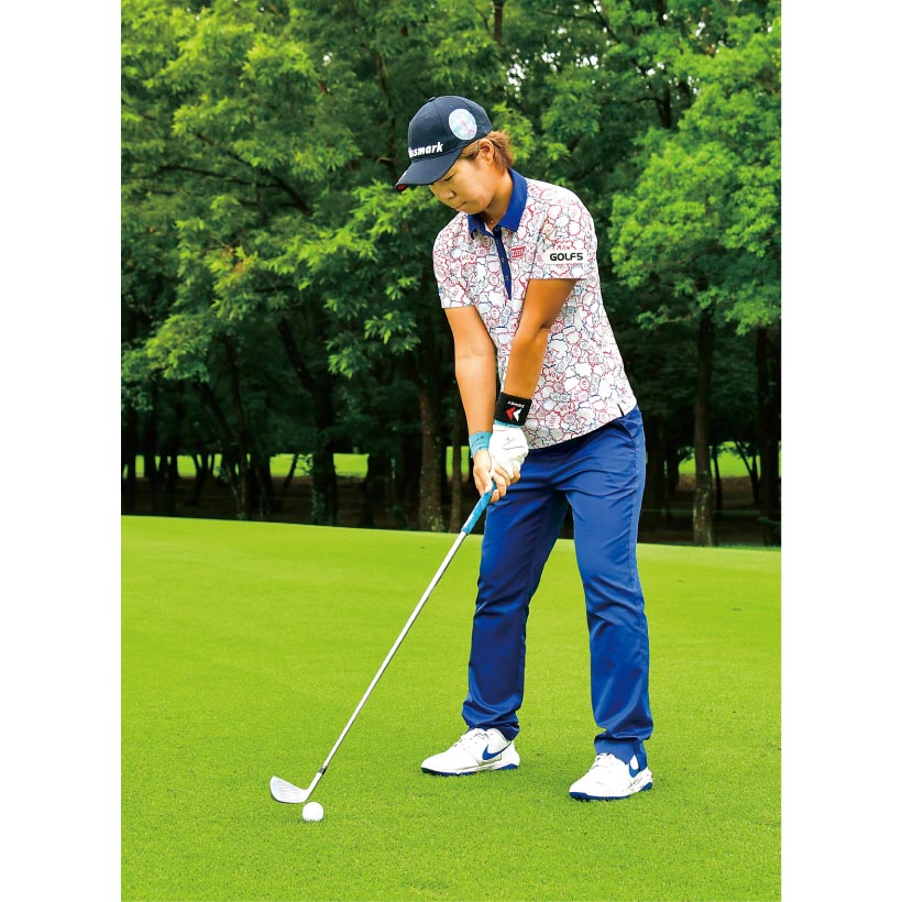 ダフって目標まで届かないミスだけは避けたいので、少しでもフェースの芯に当たりやすいようグリップをギリギリまで短く持ちます。スイングは控えめに。大きくスイングするほどインパクトの精度が低くなりますから、いつもよりトップの位置を低くしましょう。私の場合、ダウンスイングで肩が前に出てヘッドが上から入った時にダフる傾向があるので、振るというよりボールをつぶすように当てるイメージを持っています。ヒットしたらフェースの向きは変えずに、押し出すようにした方がきれいに飛んでくれます。