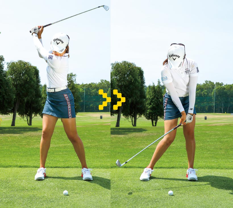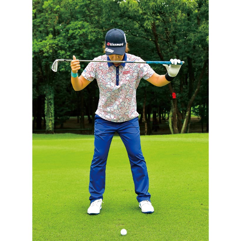 背すじが適度に伸びるとバックスイングで体が回る。手打ちにならずダフりにくい。