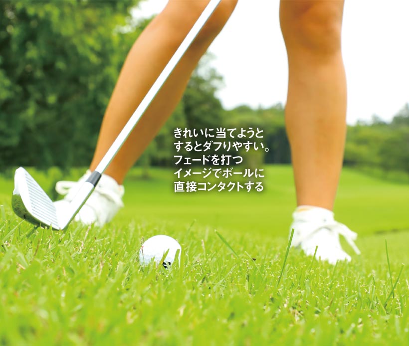 きれいに当てようとするとダフりやすい。フェードを打つイメージでボールに直接コンタクトする