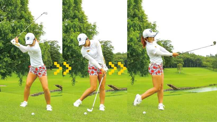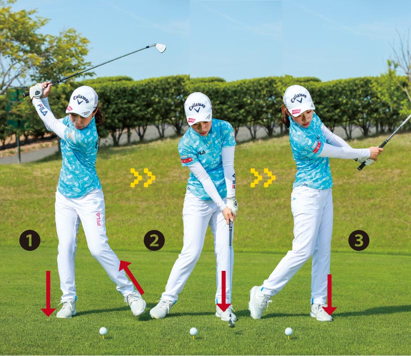 ❶クラブを引くのと同じタイミングで左足を上げます。 ❷切り返しは左足から。後はクラブの重さを感じながらスイング。 ❸ゆるまずビシッとフィニッシュまで振り切りましょう。