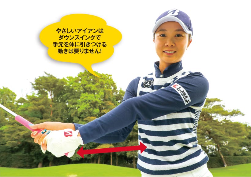 アマチュアの方は、タメを作ろうとして、ダウンスイングで手元を体に引きつける動きをしようとする方が多いですよね。でも、アイアンでは手元を体に引きつけるという動きを無理に取り入れなくても簡単に打つことができます。