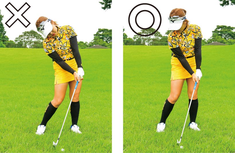 ボールは“下目使い”で見るのが正解。アゴを上に引くようにして顔を上げ、やや正面方向を向くようにして目線だけを下げる。この構えができると適度に背すじが伸びて体が回り、ディボット跡のボールでもクリーンに打てます。
