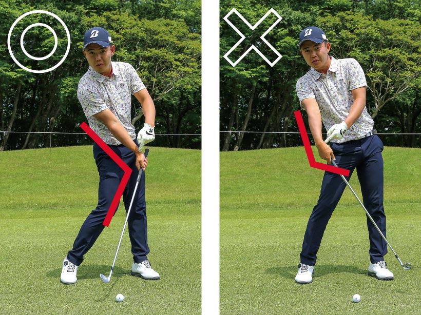 ハンドファーストに構える時の手首の動かし方がポイントです。私は右手首を支点にして、甲側に折るようにして構えます。アマチュアの皆さんはハンドファーストというと、手首を浮かせて構える人や、手元を丸ごと左側へただ動かしているだけという方が多いように見受けます。正しいハンドファーストは、右手首を支点にして甲側に少し曲げるだけ。正しく構えることによって、スイングに余計な動きを与えることのない、ダウンブローのインパクトで打てるようにしましょう。