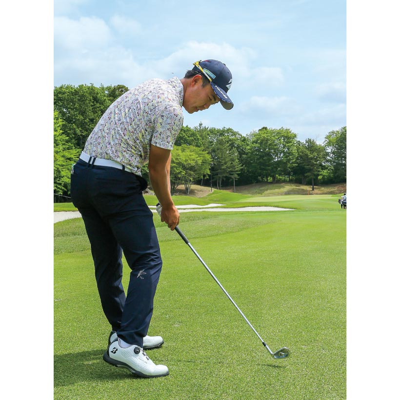 ツマ先下がりの状況でのポイントはインパクトでの左半身。手元と球が離れているショットなので、フェースのヒール側にインパクトしやすくなってしまい、薄いインパクトになりがちです。