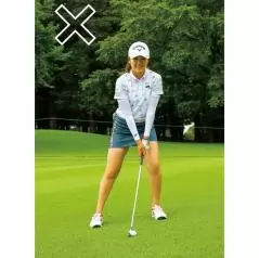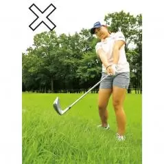 手が前に出るとフェースがかぶって最悪ラフから出ないことも。重心を左に移すだけでOK!