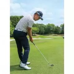 ぶ厚いインパクトを作りたい時は、フェースを立てて押し込むような動きが必要になってきます。アマチュアの方がフェースを押し込む意識を持つと、上半身を使いすぎてしまう場合がとても多いのですが、私は体の左サイドで球を押し込むインパクトをするようにしてフェースを立てています。
